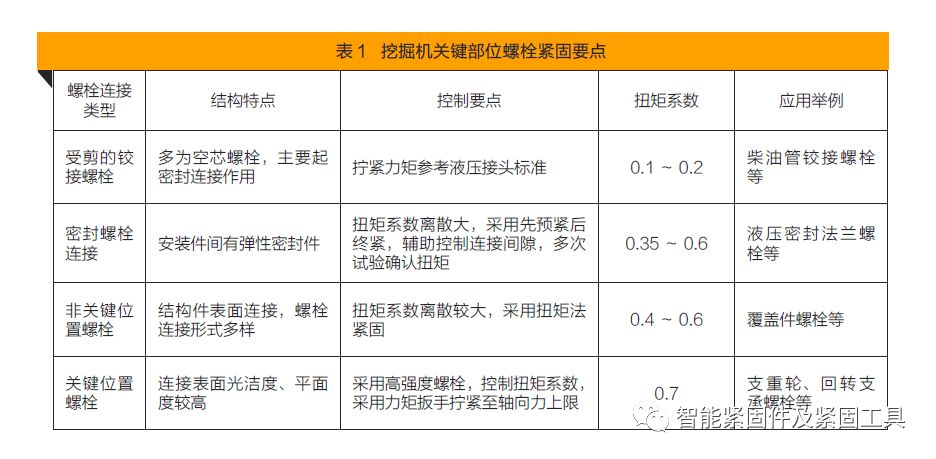 螺栓軸向預緊力下限由連接結構的功能決定,該值要保證被緊固件在工作過程中始終可靠地貼合。螺栓軸向預緊力上限由螺栓(或螺母)和被緊固件的強度及受力狀態決定,該值要保證螺栓及被緊固件在預緊和工作過程中不發生拉長、剪斷、疲勞斷裂、脫扣等現象。大量的研究表明,較大的初始預緊力可以有效提高螺栓連接防松性能,因此螺栓預緊力應在保證螺紋不被破壞前提下盡量取高值。液壓挖掘機關鍵部位螺栓緊固要點如表1 所示。