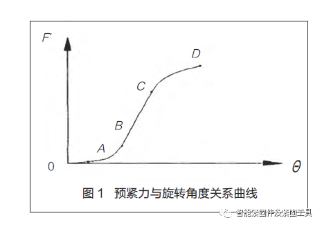 圖1 示為螺栓擰緊過程中擰緊角度與預緊力的關系曲線。OA 階段為“空轉”階段;A B階段為“貼緊”過程,此階段螺栓緊固件及被緊固件預緊力很小,但旋轉角增長迅速;B C階段為“線性”段,此階段預緊力與旋轉角度成線性關系;C 點之后螺栓進入屈服階段。按照預緊力大小,扭矩- 轉角法分為彈性區擰緊與塑性區擰緊2 種,前者發生在螺栓彈性范圍內,后者發生在螺栓被擰緊到屈服點之后。彈性區擰緊時摩擦阻力變化僅影響測量轉角起始點,若起始點選擇恰當,則對最終獲得的壓緊力影響不大。塑性區擰緊發生在塑性變形區,其壓緊力大小只取決于螺栓材料的屈服極限。