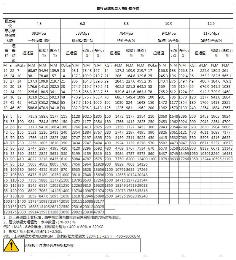 我們的扭矩推薦表是參照德國工業標準,表中的扭矩值是當螺栓達到屈服極限70%時所測定,為最大推薦值,所以用這個值會偏高,BOLTING液壓扳手在這邊建議:鎖緊扭矩扭矩值按表中推薦數值的80%來用。查看這張表我們首先要知道具體的螺栓規格或螺母規格以及螺栓材質和強度等級再對應查找。