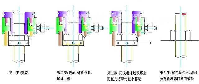 ①拆開螺帽時依據液壓拉伸器的最大提升高度的不同旋松的也不相同,嚴格按說明書要求;